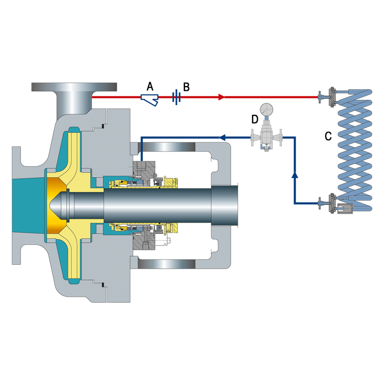 Recirculation from pump discharge through a strainer, a flow control orifice and a cooler into the seal chamber.