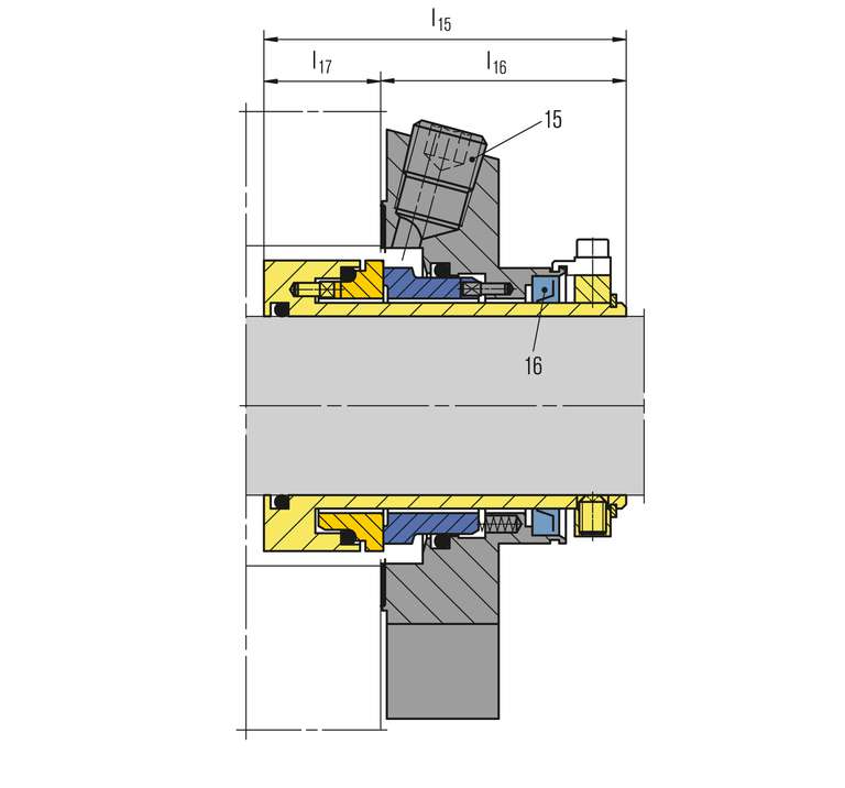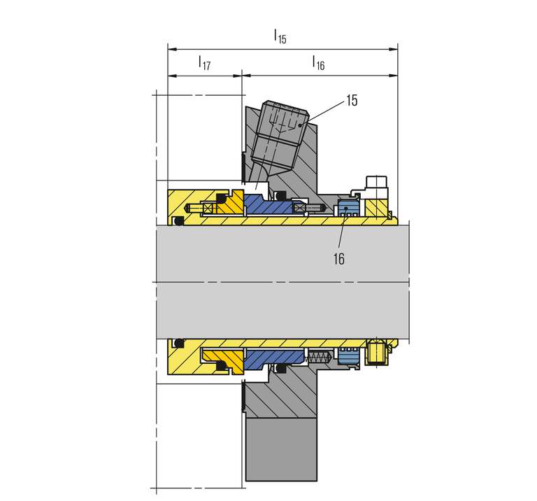 Single seal, same as Cartex-SN but with throttle ring (item 16). The cover has auxiliary connections for flushing and quench.